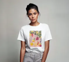 Un collage colorato di frutta fresca e fiori di ciliegio in tenui colori pastello che dà vita all'estate su uno sfondo rosa. Ideale per gli amanti del mercato della frutta e della natura!