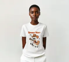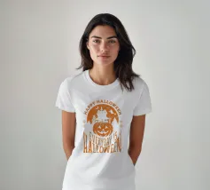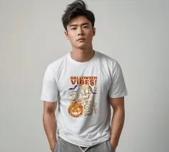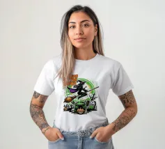 Una strega con un cappello a punta si trova di fronte alla luna piena, con una casa spettrale e un albero spoglio sullo sfondo. Le parole "Bad Witch Vibes" sono visualizzate in verde e viola, circondate da ragnatele.