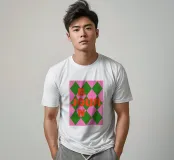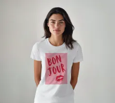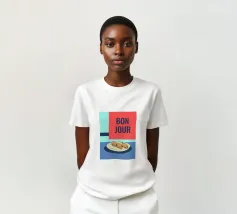 Questo motivo presenta l'allegra scritta "BON JOUR" in arancione brillante, disposta in modo dinamico su un motivo di rombi verdi su sfondo rosa. I forti contrasti di colore e la tipografia giocosa conferiscono all'immagine un aspetto fresco, energico e moderno. Ha un effetto amichevole e invitante e diffonde immediatamente il buon umore.