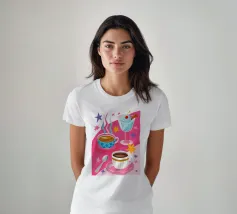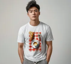 Vista dall'alto di una semplice colazione su una tovaglia a scacchi rossi e bianchi, con una tazza di caffè e un ramo d'albero. La composizione minimalista ha un'atmosfera serena, grafica e classica da caffè.