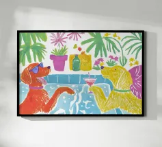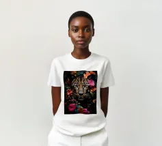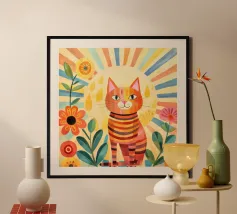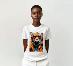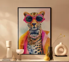 Illustrazione stilizzata di un carismatico ghepardo vestito in modo casual chic con occhiali da sole eleganti e una posa da dandy sicuro di sé. Con la sua tavolozza vibrante e il suo tocco favoloso, quest'opera d'arte celebra l'individualità, lo stile e la fiducia in se stessi. Perfetto se amate le vibrazioni della fauna tropicale con uno spirito moderno.