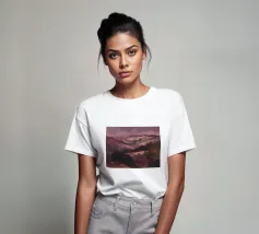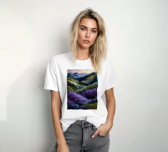 Morbide colline ondulate mostrano ricche sfumature di rosa, arancione e blu, mentre un cielo vibrante pieno di soffici nuvole esalta l'atmosfera tranquilla. Piccoli alberi punteggiano il paesaggio.