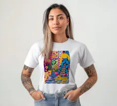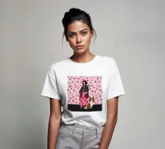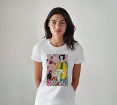 Una donna si trova in una cucina dai colori vivaci con un dalmata al suo fianco, una finestra che mostra una scena all'aperto e vari dettagli della cucina, creando un'illustrazione domestica eccentrica e affascinante.