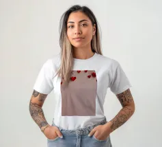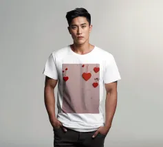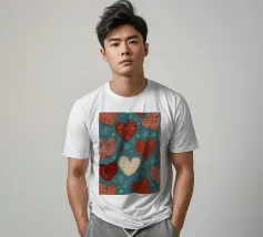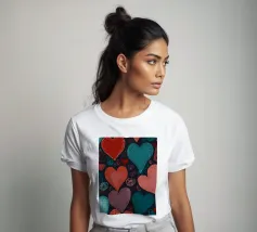 Un filo ornato da ritagli a forma di cuore in varie tonalità di rosso è appeso su uno sfondo scuro. Morbide luci calde illuminano i cuori, creando un'atmosfera romantica per San Valentino.