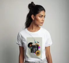 Una nostalgica stampa d'arte a collage che unisce fascino vintage e romanticismo. Un grammofono ornato esplode di fiori vivaci e dischi in vinile, mentre una coppia che balla cattura la magia della musica senza tempo. Un'opera d'arte da parete perfetta per gli amanti della musica, per gli appassionati di arredamento retrò o per chiunque sia attratto dalla narrazione di storie sentimentali attraverso il design.