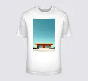 Una casa moderna e simmetrica si staglia audace sotto un cielo turchese infinito. Il vivido contrasto tra la facciata arancione bruciato e il cielo fresco e aperto evoca serenità, precisione e calore. Questo ritratto architettonico celebra il minimalismo, l'equilibrio e la quiete di un pomeriggio assolato.