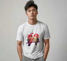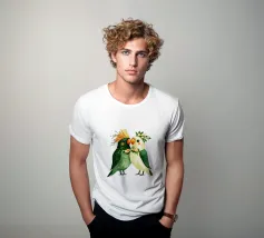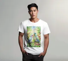 Un'immagine di due inseparabili della pesca appollaiati l'uno accanto all'altro. Elementi floreali aggiunti digitalmente. Sembrano molto rilassati e guardano l'osservatore.