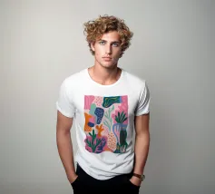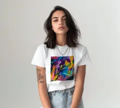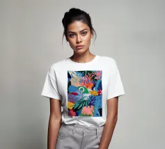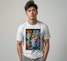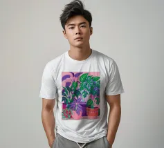Una composizione astratta alta e stretta, piena di forme e motivi di foglie colorate sovrapposte, che suggerisce una fetta vibrante di una fitta giungla verticale.