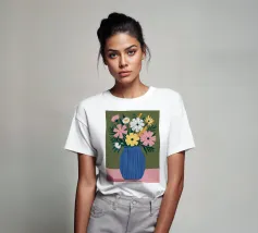 Questo allegro motivo floreale mostra un vaso blu stilizzato pieno di fiori colorati in arancione, rosso, giallo e rosa, incorniciato da una calda tonalità corallo. Il disegno irradia gioia di vivere e armonia ed è perfetto per murales, cuscini, tazze, cover per cellulari e altro ancora. Ideale per chi ama un'estetica fresca e moderna e desidera ravvivare la propria casa con accenti colorati e naturali. Questa composizione floreale senza tempo si adatta a qualsiasi ambiente e a qualsiasi stile di casa.
