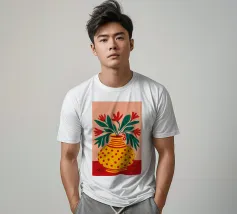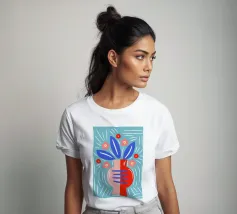 Ravvivate la vostra casa con questo moderno motivo floreale. Il vaso stilizzato in rosso e rosa, circondato da foglie blu e fiori delicati su uno sfondo azzurro, conferisce a questo disegno un aspetto grafico e contemporaneo. Ideale per decorazioni murali, cuscini, tazze, cover per cellulari e molto altro ancora. Questo motivo è perfetto per chi ama i disegni giocosi e colorati con un tocco di arte e modernità. Crea accenti vivaci e si adatta a un'ampia varietà di stili di interni.
