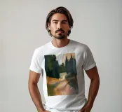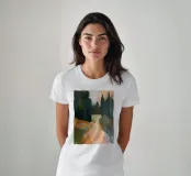 Paesaggio astratto dipinto con verdi profondi e calde tonalità della terra, che suggerisce un tranquillo sentiero nella foresta immerso in una luce soffusa.