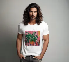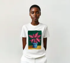 Una pianta di anthurium rosa di grande effetto si trova in un vaso variopinto e decorato su uno sfondo di un vibrante rosa caldo. La composizione è una celebrazione audace ed elegante del colore e delle piante tropicali.