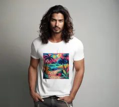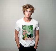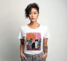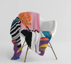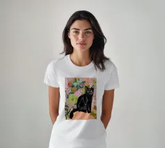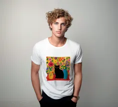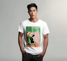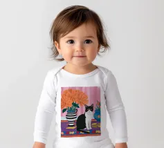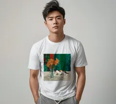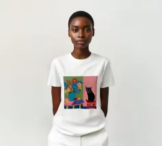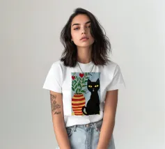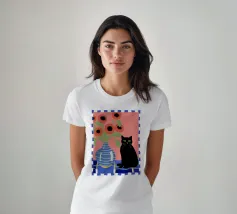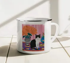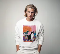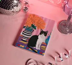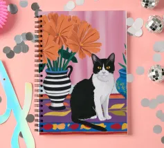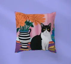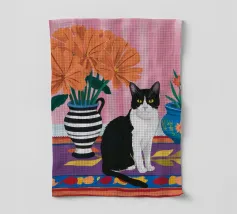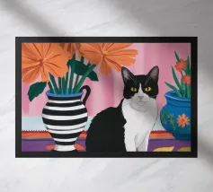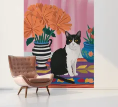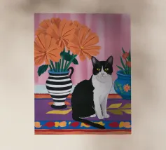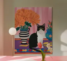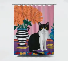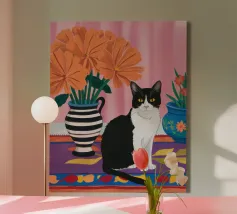Un gatto bianco e nero siede regalmente dietro un grande vaso di fiori con motivi a strisce vivaci, sullo sfondo di una tenda rosa, creando una natura morta suggestiva e affascinante.