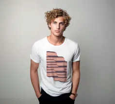 Un design geometrico di grande effetto, caratterizzato da linee diagonali alternate di colore marrone chiaro e scuro che si intersecano in varie angolazioni, creando un motivo visivamente dinamico e accattivante.