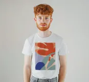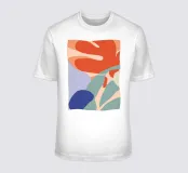 Una composizione astratta ispirata a Maraoui, con forme semplici e ritagliate in colori primari come il rosso, il blu e l'arancione su un morbido sfondo color lavanda. L'opera d'arte è al tempo stesso giocosa e sofisticata.
