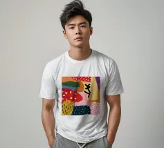 Un collage astratto vibrante ed eclettico caratterizzato da un mix di motivi audaci, tra cui righe, stampa ghepardo e pois. La composizione è un'espressione giocosa ed energica di uno stile moderno bohémien o massimalista.