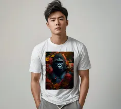 Un imponente gorilla tiene in mano una banana nel mezzo di un lussureggiante paesaggio tropicale. Questo disegno realizzato ad arte combina piante esotiche, colori vivaci e la maestosa presenza di un gorilla. Perfetta per progetti che celebrano la bellezza della natura e della fauna selvatica, questa illustrazione trasmette un forte ma armonioso senso di natura selvaggia e tranquillità.Gorilla maestoso: rappresentazione di un gorilla orgoglioso che tiene in mano una banana. Dettagli tropicali: circondato da piante e frutti esotici.