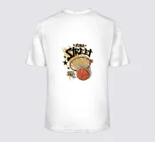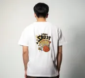 Design urbano del basket con tipografia graffiti, tavolozza arancione e nera e canestro in rete. Uno stile street distintivo per abbigliamento sportivo e casual.