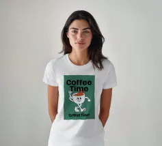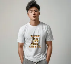 Una tazzina da caffè e un personaggio a forma di cuore sono raffigurati mentre si tengono per mano con la scritta "Ho bisogno di una sola cosa per riscaldare il mio cuore, il caffè".