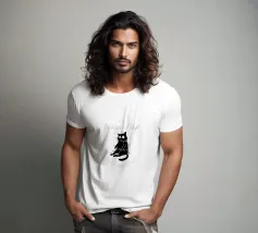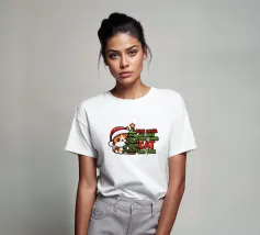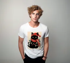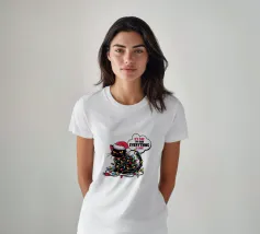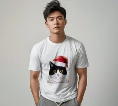 Un gatto nero che indossa un cappello da Babbo Natale è spiritosamente impigliato in luci natalizie colorate. Il testo accanto al gatto recita: "È abbastanza allegro?".