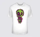 Un'illustrazione digitale vibrante e surreale di un teschio alieno che si fonde con una lampadina gocciolante, caratterizzata da colori verde neon e magenta su uno sfondo viola scuro. Il design inquietante e gocciolante combina l'estetica horror e fantascientifica.