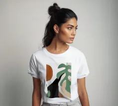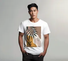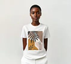 L'immagine presenta un'illustrazione astratta con una grande foglia di monstera nera e il contorno di una mano. Lo sfondo è costituito da forme morbide e fluide nei toni del beige e del marrone, che creano un'atmosfera armoniosa e organica.