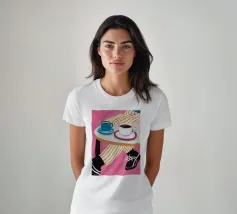 Un motivo di foglie stilizzate nei toni del verde, del rosa e della terracotta, ispirato ai ritagli di Henri Maraoui. La disposizione suggerisce una danza aggraziata di forme botaniche.