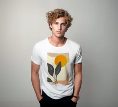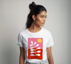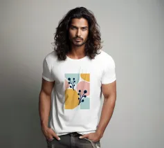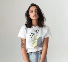 Un disegno botanico minimalista presenta un ramo bianco delineato con foglie. Linee curve e forme organiche nei toni del blu, del verde e del giallo creano uno sfondo moderno e astratto.