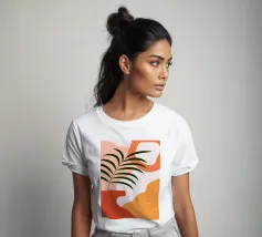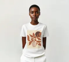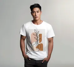Il design minimalista è caratterizzato da una semplice pianta in vaso con foglie scure, contrapposta a forme astratte e sovrapposte nei toni terrosi del rosso, del grigio e del bianco. Le linee pulite e i blocchi di colore decisi creano un'estetica moderna e rilassante.