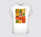 Una composizione vivace e generosa di vari frutti tropicali stilizzati come ananas, papaya e anguria. L'opera d'arte è una celebrazione colorata e gioiosa delle dolci offerte esotiche della natura.