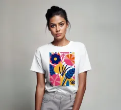 Un motivo vivace e senza soluzione di continuità di foglie stilizzate e forme botaniche in una tavolozza di rosso, blu, rosa e giallo, che crea un senso di movimento ritmico e naturale.