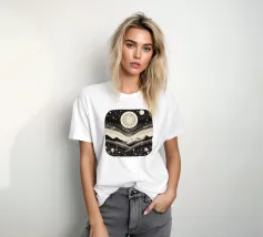 Questa stampa in bianco e nero in stile linoleografia ritrae un ipnotico paesaggio notturno. Una luna piena splendente domina il cielo stellato, proiettando la luce su un fiume tortuoso che scorre tra montagne aspre e strutturate. L'intricato lavoro al tratto crea un senso di movimento e profondità, evocando mistero e tranquillità.