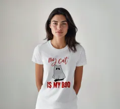 Un gatto dall'aspetto scontroso con strisce scure è illustrato sopra il testo "Il mio gatto ti sta giudicando in silenzio!". La frase utilizza una tipografia giocosa, con l'impronta di una zampa al posto della lettera "O".