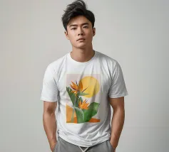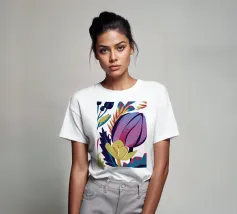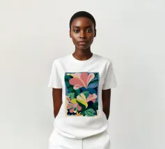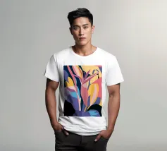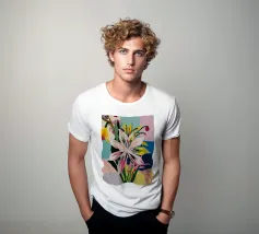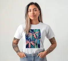 Un'illustrazione splendidamente dettagliata cattura l'eleganza di un'orchidea in fiore, con vibranti petali rosa, bianchi e gialli contrapposti a foglie blu intenso.
