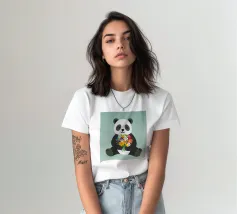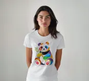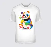 Illustrazione colorata di un simpatico panda con un ramo di bambù. Il motivo giocoso combina cordialità, calma e aree di colore moderne - ideale per i fan dei panda e per i disegni creativi di animali.