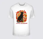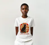 Sagoma di pantera nera circondata da fiori arancioni e rossi. Tavolozza calda, motivo floreale caratteristico; ideale per progetti audaci, tessuti grafici e accessori.