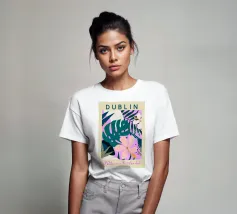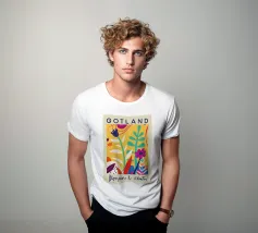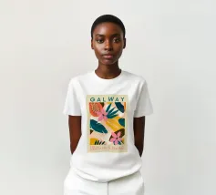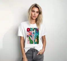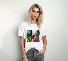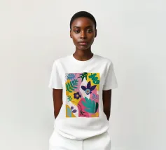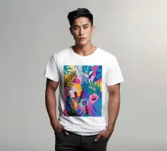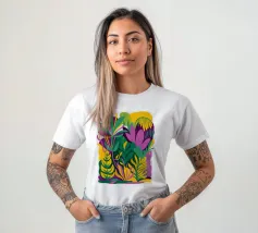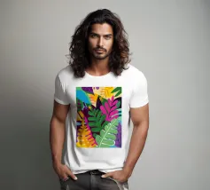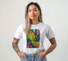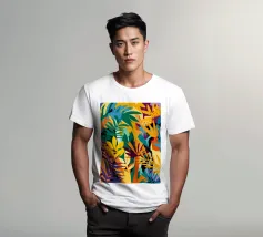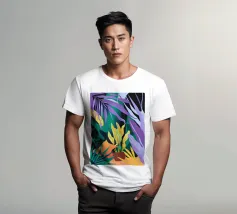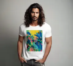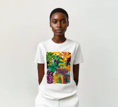 Una lussureggiante scena di giungla incornicia un grappolo d'uva viola, creando una natura morta unica e inaspettata che fonde il fogliame tropicale con la frutta del frutteto in una composizione vibrante.