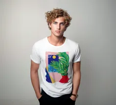 Una composizione astratta presenta una ciotola di fragole in mezzo a un turbinio di forme e motivi organici e colorati, creando un'interpretazione fresca e moderna di un classico dell'estate.