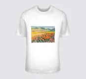 Un campo di papaveri arancioni crea un brillante patchwork di colori su dolci colline verdi e dorate, rese in modo stilizzato e moderno che enfatizza la gioia del paesaggio.