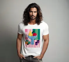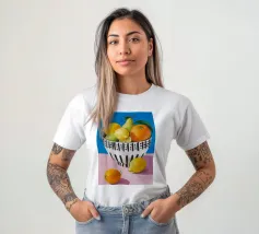 Una moderna natura morta di due pere gialle in una ciotola con un audace motivo a zig zag in bianco e nero. Lo sfondo a scacchi rosa e viola aggiunge un ulteriore livello di grafica giocosa alla composizione.