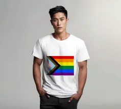 Rappresentazione suggestiva e simbolica della bandiera del Progress Pride, questo disegno fonde il tradizionale arcobaleno con l'aggiunta di strisce che rappresentano le comunità trans, nere e brune.
