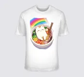 Adorabile gatto bianco comodamente seduto in una ciotola di ramen, circondato da uno stravagante arcobaleno.