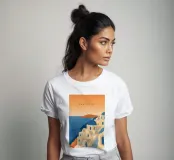 Design di viaggio minimalista della Grecia con le famose case bianche dell'isola greca di Santorini, le rocce vulcaniche e il blu del Mar Mediterraneo. Tipiche case graziose come nei villaggi di Oia e Fira.