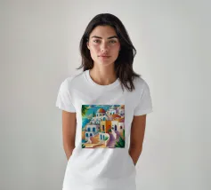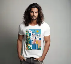 Una scena pittoresca di Santorini è caratterizzata da iconici edifici bianchi con cupole blu e una porta blu vibrante, che si affaccia sul mare scintillante sotto un cielo limpido con uccelli, incarnando il fascino idilliaco dell'isola greca.