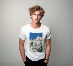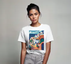 Una pittoresca illustrazione degli iconici edifici bianchi e delle cupole blu di un'isola greca, probabilmente Santorini, affacciata sul mare. La scena è una perfetta rappresentazione, inondata di sole, di un paradiso mediterraneo.