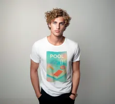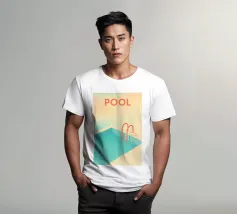 Poster raffigurante una piscina estiva con una scala arancione e riflessi d'acqua stilizzati. Un gioco di ombre, luci grafiche e una tavolozza solare. Perfetto per un look vintage e rinfrescante.