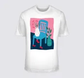 Un'affascinante ed eccentrica natura morta con una pianta in vaso appoggiata su una sedia blu brillante. La composizione è semplice ma piena di carattere, con colori vivaci e uno stile giocoso.