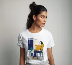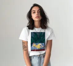Questo disegno mostra una donna dai capelli viola che si sdraia con disinvoltura su una poltrona giallo senape: rilassata, sicura di sé, completamente immersa nel momento. Il contrasto tra lo sfondo scuro, il pavimento rosa e la poltrona di velluto giallo crea un linguaggio visivo potente e moderno dal fascino retrò.