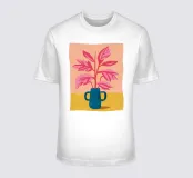 Un'illustrazione semplice ma d'effetto di una pianta dalle foglie rosa in un audace vaso blu su uno sfondo caldo, che celebra la bellezza del colore e della forma botanica minimalista.