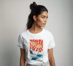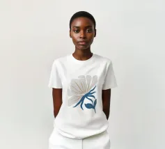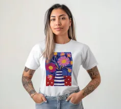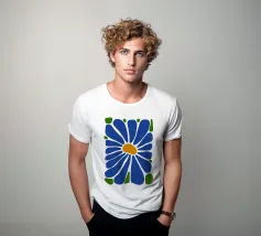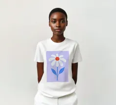 Un'illustrazione audace e grafica di un singolo grande fiore, probabilmente un anemone, con petali a strisce bianche e blu e un centro giallo. Lo sfondo rosso brillante rende il fiore il fulcro assoluto di questo pezzo potente.